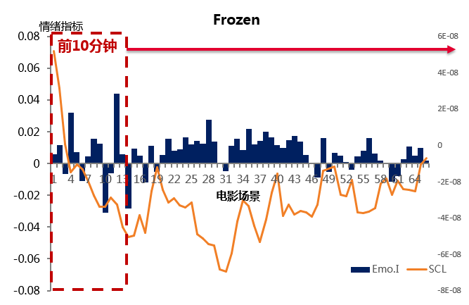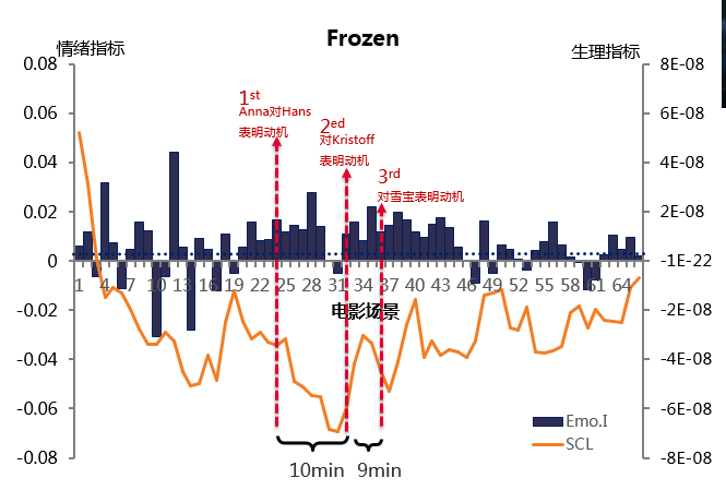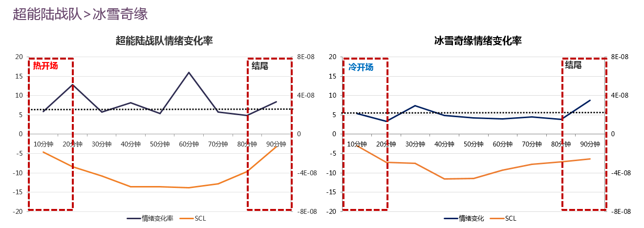 通过观察两部影片情绪指数的变化,我们可以直观地看出影片的节奏。超能陆战队的整体节奏比冰雪奇缘快(6.19>5.59),情绪波动较大。由开场前十分钟的情绪值可知,冰雪奇缘采用冷开场(无激烈动作/悬念)的方式,节奏水平比超能陆战队(激烈打斗)的热开场方式慢。而超能陆战队中期的情绪值波动较多,节奏表现比冰雪奇缘更快。但两部电影的结尾节奏都呈加快的趋势。
