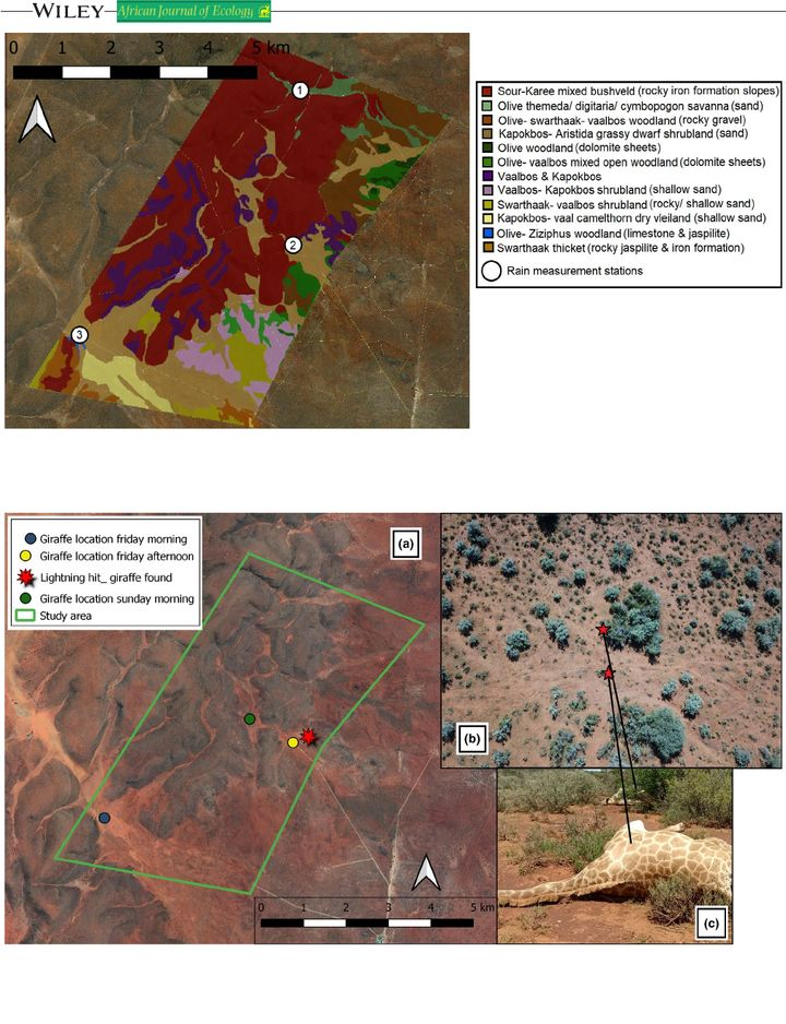 2020年2月29日,科学家Ciska Scheijen在南非跟踪8只长颈鹿时,突然遇到暴雨天气,当天无法跟踪长颈鹿。时隔两天后,他们再次找到了长颈鹿群,发现仅剩下6只,职业敏感性告诉Ciska Scheijen,那两只长颈鹿有可能被雷劈中了,大概率遇难了。