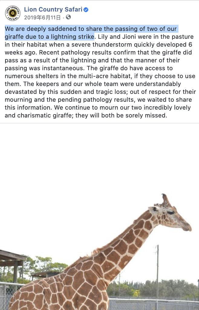 这不是人们第一次发现长颈鹿遭雷劈,2019年6月美国佛罗里达野生动物园遭雷击,其他动物都安然无恙,唯独两只长颈鹿不幸遇难。