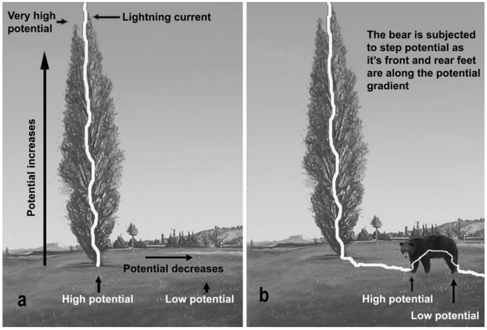 不过,由于地表湿润的土壤电阻比较大,这就意味着树中心电压最高,距离树越远,电流相应的也越小,这时,如果人站在树下的话,人的电阻会比土壤的电阻小,电流就会优先从人的一条腿流经另一条腿,两腿间距越大,电压越大,受伤程度也就越高。