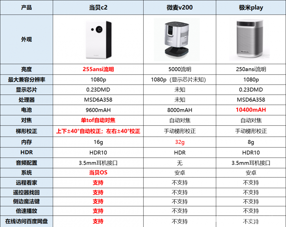 当下微型投影风盛行,“袖珍、迷你、时尚”变成了年轻人选择的关键词,各大投影仪商家在投影仪外观方面做足了功夫,更是让外貌协会者难以抉择。最近就经常有人来提问微麦v200和极米play还有当贝c2这几款价格都差不多,该选那哪一款呢?下面我就个大家做一个详细的参数对比。