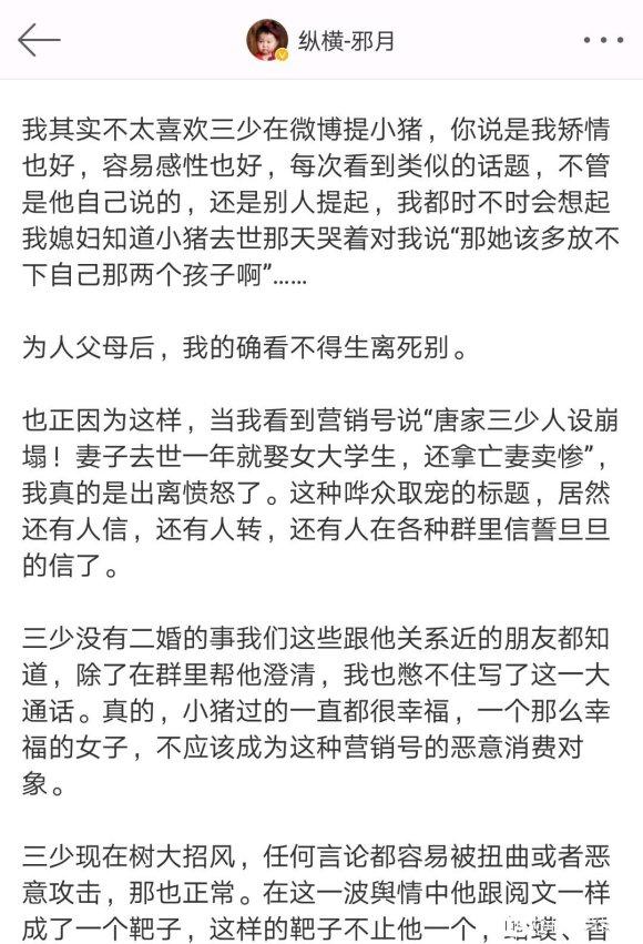 5.之后是2020年5月27日的唐家三少娶女大学生事件。此次事件是所有黑唐家三少的事件里唯二被明确辟谣了的中的一个。事件起源于2020年5月27日,微博上一名叫辛长安—安的网友称唐家三少在妻子2018年去世后一年就娶了女大学生。这件事顿时就爆开了。原因是唐家三少在公众面前一直都是【专情】 人设,不管是斗罗大陆里唐三原型,还是唐家三少出版的《为了你我愿意热爱整个世界》,还是唐家三少带着李默满世界治病的新闻,都给唐家三少立起了专情人设。哪怕唐家三少其他黑点很多,但是他专情的人设还是在的。但是女大学生这新闻一出,对三水的人设就是致命打击了。
