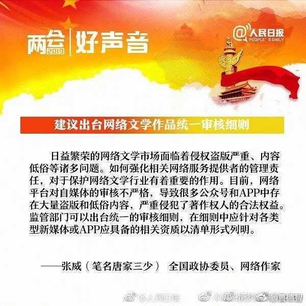 4.2019年3月11日开始的净网行动和唐家三少的提案。印象深刻的人大概都还记得,2019年3月1日,三水参加两会,提出了整治网络文学中存在低俗内容,建议监管部门出台统一审核细则的提案。结果3月11日,“扫黄打非”部门对网络文学开展了一次力度很大的净网行动,个人印象中当时起点一口气删了大概40万本小说,甚至恐怖类的作品直接没了。从3月1日到3月11日,前后只差了10天,自然很多人都会把这份“功劳”送给三水。就算三水自己解释说本意是希望出台统一审核细则,而不是要删网文,可是那又有什么用呢,就客观结果来说,还是有那么多网文被删了。不管三水是主观的还是客观的,都没有用。更重要的是,三水自己早期的作品也存在大量后宫、涉黄的内容,他提出整治低俗内容的提案,对于很多网文读者来说,当然是放下筷子骂娘的双标举动。