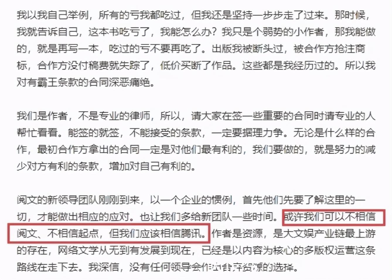 关键主要是第二点,当时阅文集团陷入风波的时候,唐家三少站出来说了一句很有争议的话,那就是“我们可以不相信起点,不相信阅文,但可以相信腾讯”,这句话自然又一次引起了轩然大波,因为在公众眼里,阅文就是腾讯旗下的下属公司,就是腾讯的儿子,阅文有问题,凭什么我们还要相信腾讯?儿子不好,老爹能好到哪里去?更何况腾讯和腾讯资本家们一直以来被黑的还少吗?