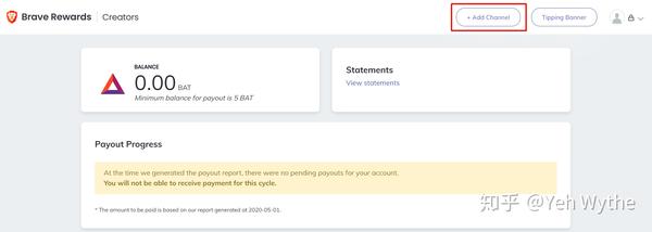 ,注册成为经过验证的内容创作者,注册内容创作者是要求启用F2A两步验证。然后,注册成为创作者后,点击Add Channel,关联自己的社交媒体平台账户,并生成自己的专属邀请链接。目前,Brave 已支持个人网站、YouTube、Twitter、Twitch 、Vimeo、Reddit、Github 等主流平台。