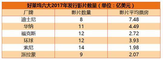 迪士尼上线的影片并不是最多的,但它的影片平均票房(本土+海外)最高。2017年,迪士尼共上线8部影片,影片平均票房7.5亿美元。索尼影业上线影片最多,共有14部,然而单部影片的平均票房最低,只有不到2亿美元。