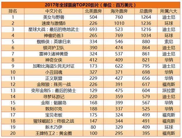 2017年的全球电影票房冠军是迪士尼的《美女与野兽》,总票房高达12.6亿美元,其次是环球的《速度与激情8》和迪士尼的《星球大战:最后的绝地武士》,分别获得总票房12.4亿和12.2亿美元。