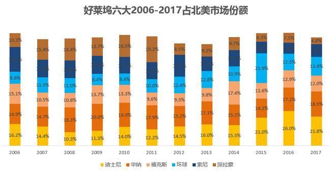 从好莱坞六大巨头过去十年占据北美市场份额的变化,可以看到一些六大变迁的基本情况:总体上来看,从2006年到2017年,好莱坞六大合计占北美总票房市场份额的80%左右,比较稳定。分个体看,迪士尼的份额逐年攀升,在2014年及之前,份额一直在约15%左右,近两年攀升至20%以上,稳坐第一,甚至在2016年,单独迪士尼一家就占据了北美票房市场的1/4;环球在过去十年不断攀升,在2012年以前一直都只有不到10%的份额,2015年异军突起,当年甚至打败了迪士尼,占到北美电影票房市场份额的21.9%,近两年环球的市场份额则稳定在13%左右;华纳兄弟近十年的北美市场份额一直稳居高位,占18%左右;索尼和派拉蒙的份额则逐年下降,特别是派拉蒙,由十年前的15%左右,缩水至2017年的4.8%,在过去6年中,派拉蒙在好莱坞六大里一直居末位。