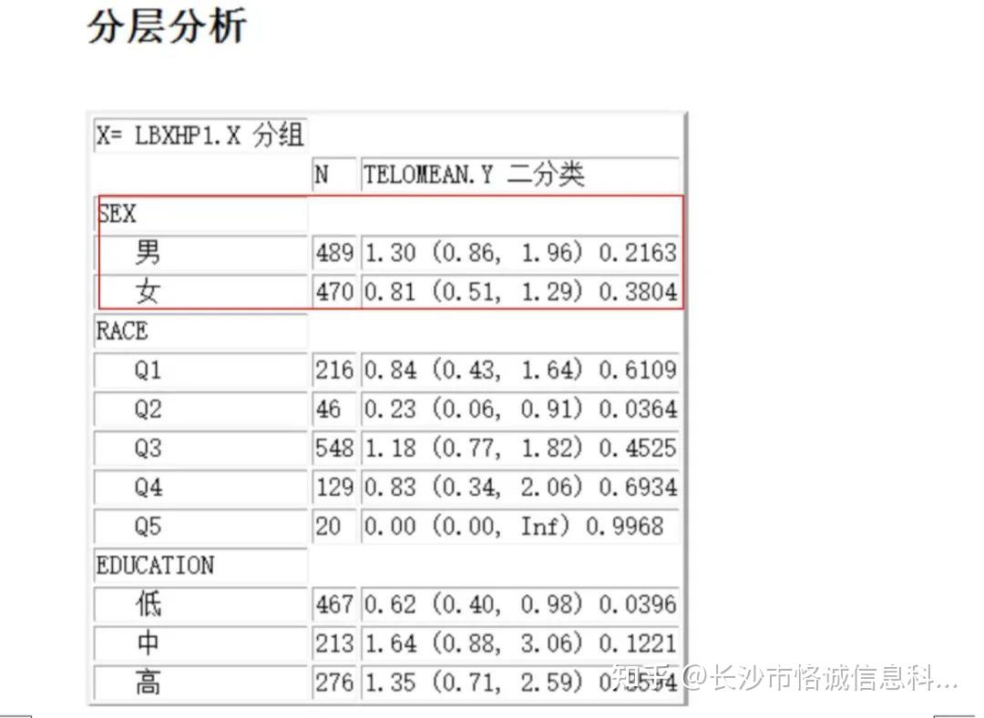 红框处:在男性中,X每增加一个单位,Y增加1.30个单位,置信区间是0.86-1.96,P值是0.2163;在女性中,X每增加一个单位,Y增加0.81个单位,置信区间是0.51-1.29,P值是0.3804。