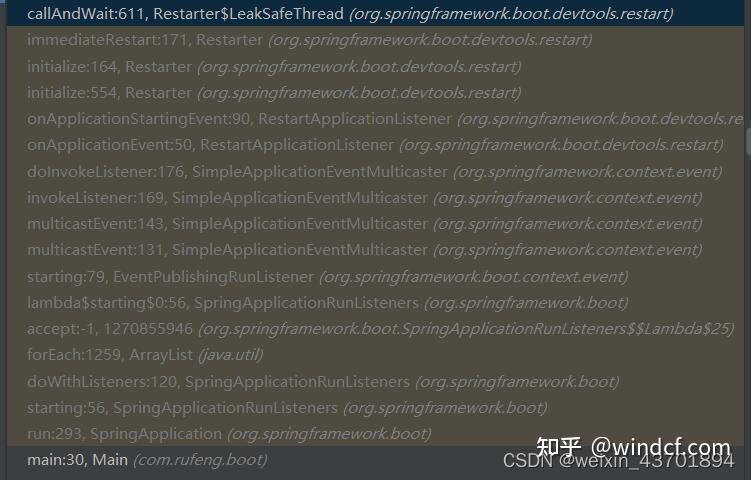 我们来捋一下流程,此时仍然在main线程中,在main线程中,Restarter的initialize方法中,初始化Restarter单例,首次初始化完毕后,进入immediateRestart方法,获取LeakSafeThread线程对象,传入Callable对象,调用其callAndWait方法,该方法启动新线程,此时,两个线程开始了,也就是上图控制台第二个线程Thread-1。 启动后,调用LeakSafeThread的join方法,注意,仍然是在main线程中,此时重启线程正在运行,而main线程等待重启线程执行完,被join阻塞。 调用堆栈如下: