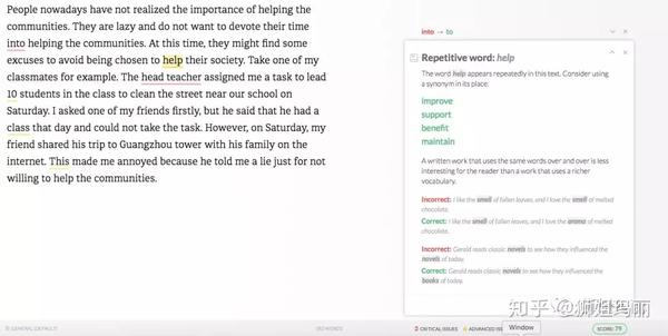 比如这篇作文,多次用了help, grammarly会给建议说这里重复用此了,并且会给出相应的替换词。 比如help可以替换为improve, support, benefit或者是maintain. 同时在下面还会给出示范和讲解。