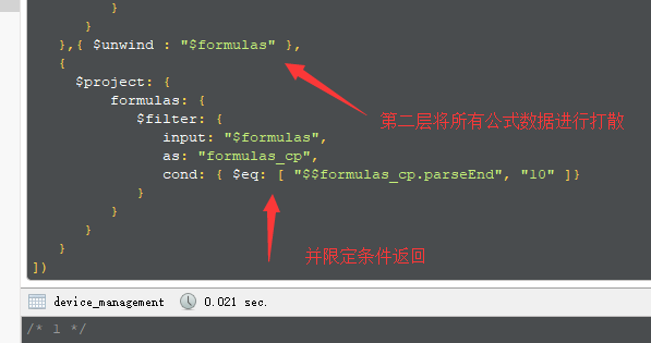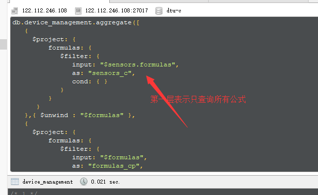 | db.device_management.aggregate([ { $match: { '_id':ObjectId("5ea79af3dd905336d0df1865"), } }, { $unwind : "$bindSensorInstructs" }, { $project : { "addressOrKey": "$bindSensorInstructs.addressOrKey", "mid": "$bindSensorInstructs.mid", "sensorId": "$bindSensorInstructs.sensorId" } }, {$count: "count"}]) |