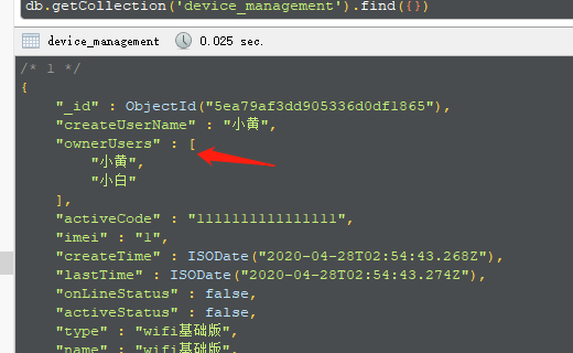 | db.device_management.aggregate([{ $unwind: "$ownerUsers" }, { $group: { _id: "$ownerUsers", "userName": { '$first': '$ownerUsers' } } }, { $match: { '_id': { $regex: "小" } } }, { "$project": { "_id": 0, "userName": 1 } }]) |