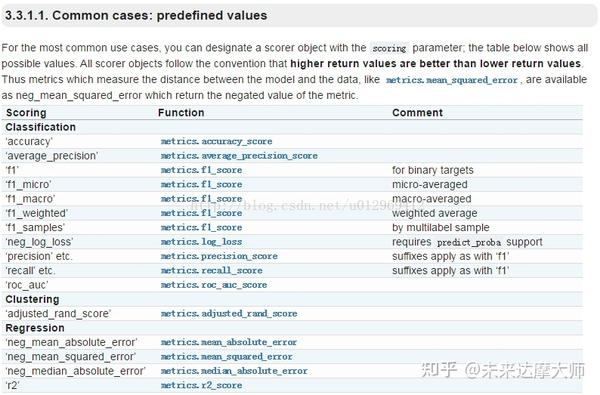 For the most common use cases, you can designate a scorer object with the scoring parameter; the table below shows all possible values. All scorer objects follow the convention that higher return values are better than lower return values . Thus metrics which measure the distance between the model and the data, like metrics.mean_squared_error , are available as neg_mean_squared_error which return the negated value of the metric.