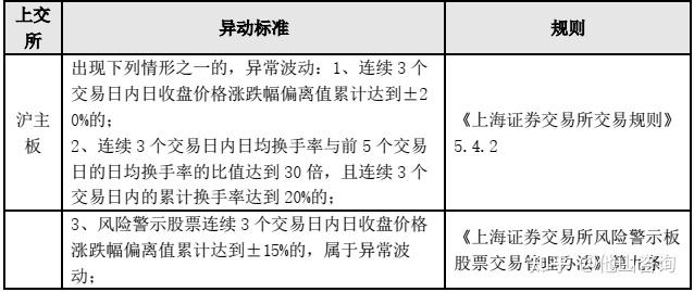 答:股票交易异常波动的标准各个板块略有不同,具体的异常波动标准如下: