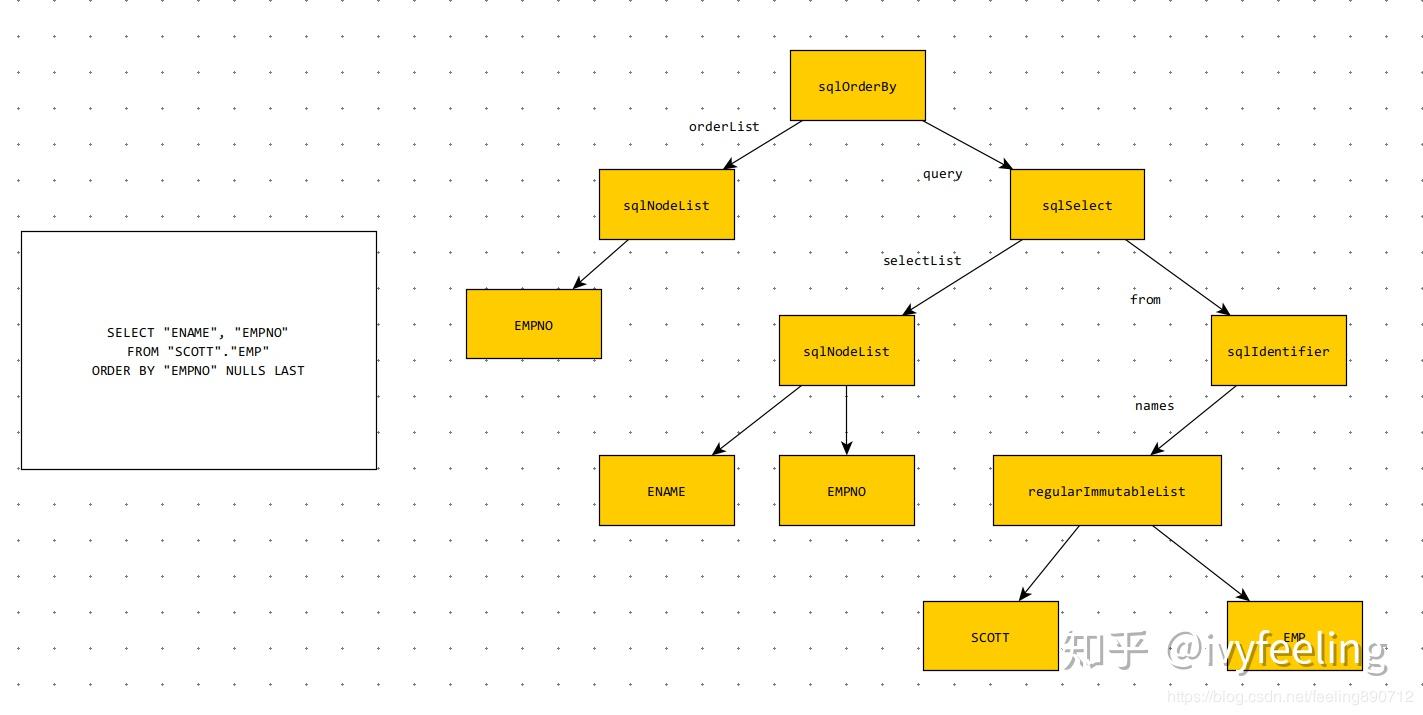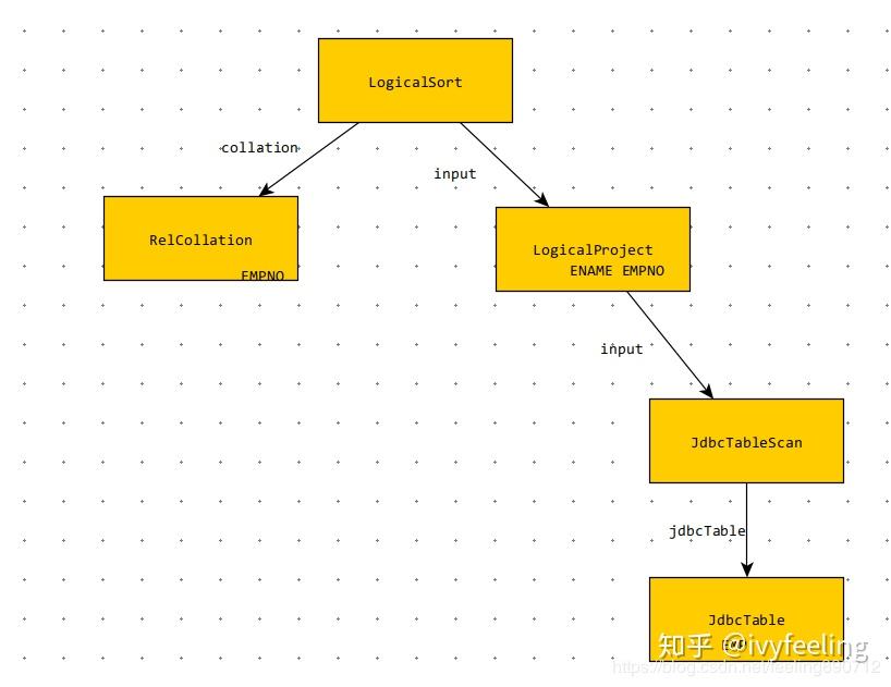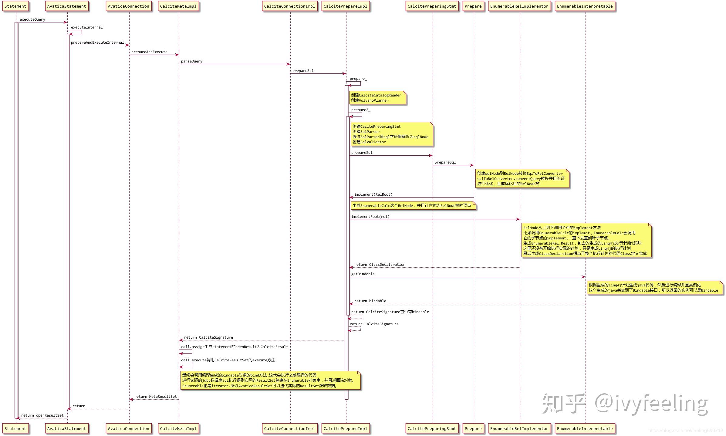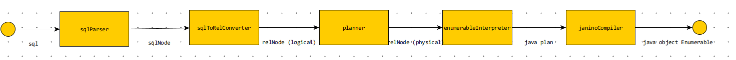 - sql解析 :calcite首先会使用它实现的SqlParser解析sql字符串,生成SqlNode为节点的AST(抽象语法树)。 - 生成逻辑关系表达式 :得到SqlNode的AST后,Calcite会使用SqlToRelConverter将SqlNode转换为RelNode组成的逻辑关系表达式树。 - 优化 :Calcite会使用planner(优化器)优化逻辑关系表达式,生成最优的物理关系表达式树(带有具体的算法的算子)。 - 生成Linq4j表达式 :在获得物理关系表达式后,Calcite的EnumerableRelImplentor可以通过物理关系表达式树转换为Linq4j表达式树,通过Linq4j表达式树可以生成一个Java Class。这个Java Class的实例知道如何与后端数据库进行JDBC连接,并且如果是多数据源查询并且需要join、sort、filter等,它也知道这些操作要如何处理。 - 编译 :前面生成的Java Class会通过运行时编译(Calcite使用 Janino编译器 ),编译后生成对象实例,这个实例实现了Iterator接口。会保存在要返回的ResultSet中,后面ResultSet调用相应的方法取数据时,最终是调用这个实例对象获取数据。