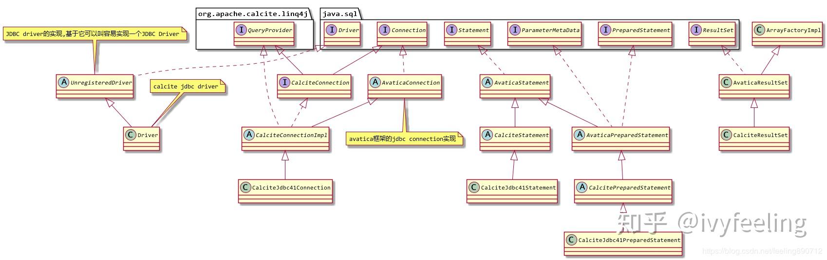 Calcite不仅实现了它的核心功能,也为开发者提供了一个称为Avatica的构建JDBC和ODBC Driver的框架,如果希望实现自己的JDBC Driver可以详细学习一下 这个框架 。 从上图可知,Calcite core模块中的JDBC的类实现都是基于Avatica框架。我们在使用Calcite进行JDBC查询时Connection,Statement和ResultSet实例其实就是CalciteJdbc41Connection,CalciteJdbc41Statement,CalciteResultSet。