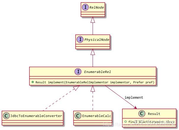 方法会调用物理表达式树根节点(这里是EnumerableCalc)的implement方法,父节点又会迭代调用子节点的implement方法。最终返会获得生成的linq4j表达式树。通过上面代码片段的