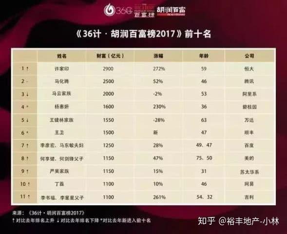 去年《胡润百富榜2017》显示,中国恒大许家印以2900亿元的财富力压“二马”(马化腾、马云),跻身中国首富。他是胡润百富榜19年来第12位中国首富,也是历年来财富最高的首富。46岁的马化腾以2500亿元超越马云位列第二。53岁的马云及其家族财富缩水2%,以2000亿元退居第三。