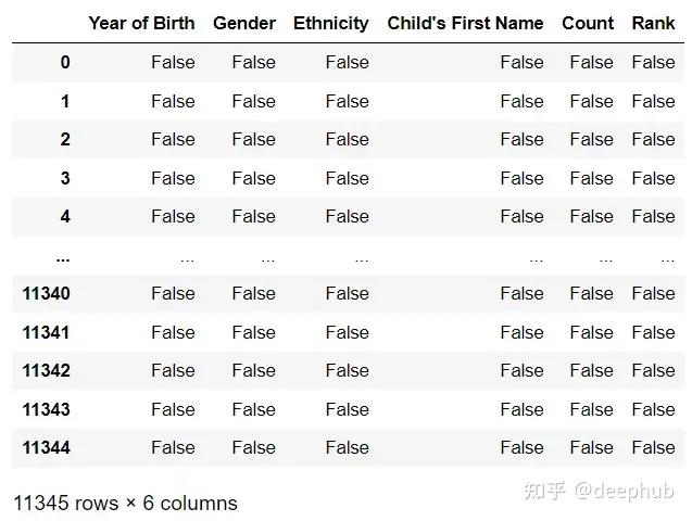 isnull()方法返回一个与原始DataFrame形状相同的DataFrame,通过True或False值,指示原始DataFrame中的每个值是否缺失。缺失的值NaN或None,在结果的DataFrame中将为True,而非缺失的值将为False。