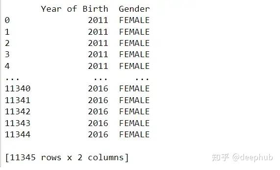 在上面的例子中,df.loc[:, ['Year of Birth', 'Gender']]选择名为'出生年份'和'性别'的列。