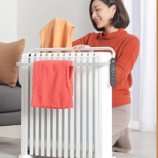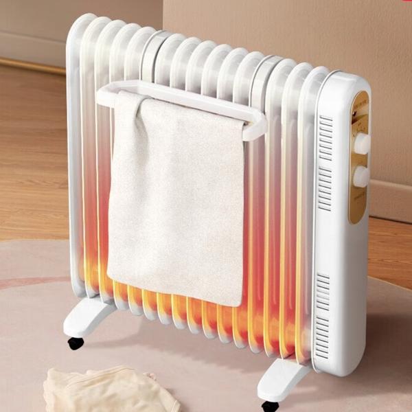 这款电油汀采用330号导热油,13片宽油汀片,高度达到575mm,热效提升30%,功率1000W-2200W,温度调节15-45℃,带烘衣架。