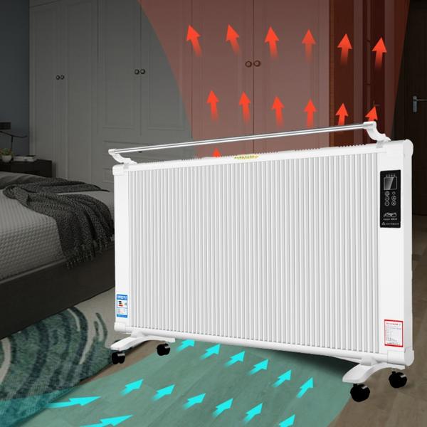由于母板+金属膜制作而成的平板金属膜发热,对流取暖兼辐射取暖,通电后发热体周围的空气被加热上升,从出气口流出,而周围的冷空气从进气口进入补充。如此反复循环,使室内温度得以提高。