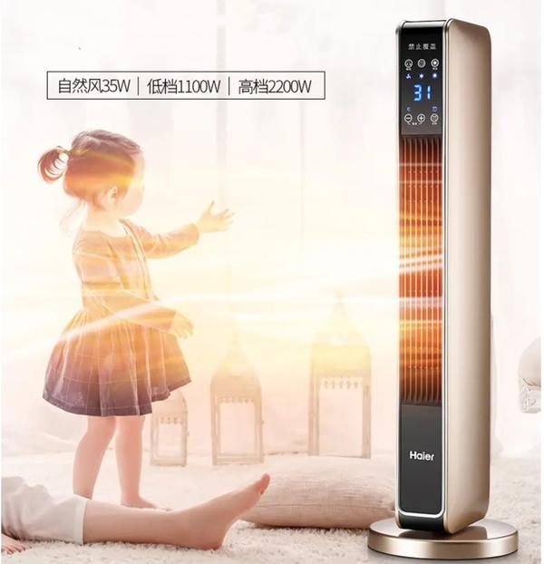 海尔的这款暖风机有两档1100W和2200W暖风和35W自然风,功率大,升温快。