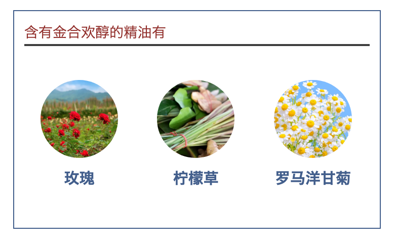 含有金合欢醇的精油有玫瑰、柠檬草、罗马洋甘菊、依兰和晚香玉。