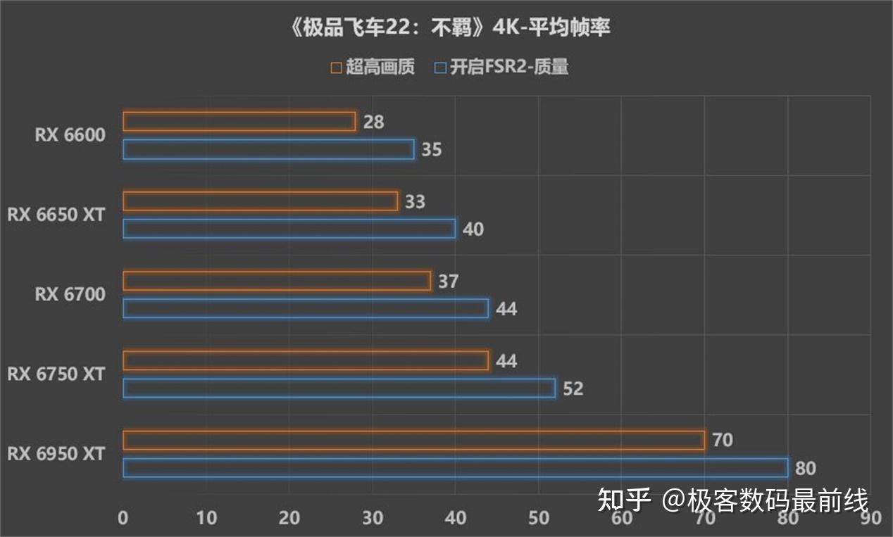 在4K分辨率超高画质下,仅有RX 6950 XT的平均帧率达到70FPS,开启了AMD FSR 2-质量后,性能表现提升14%左右。