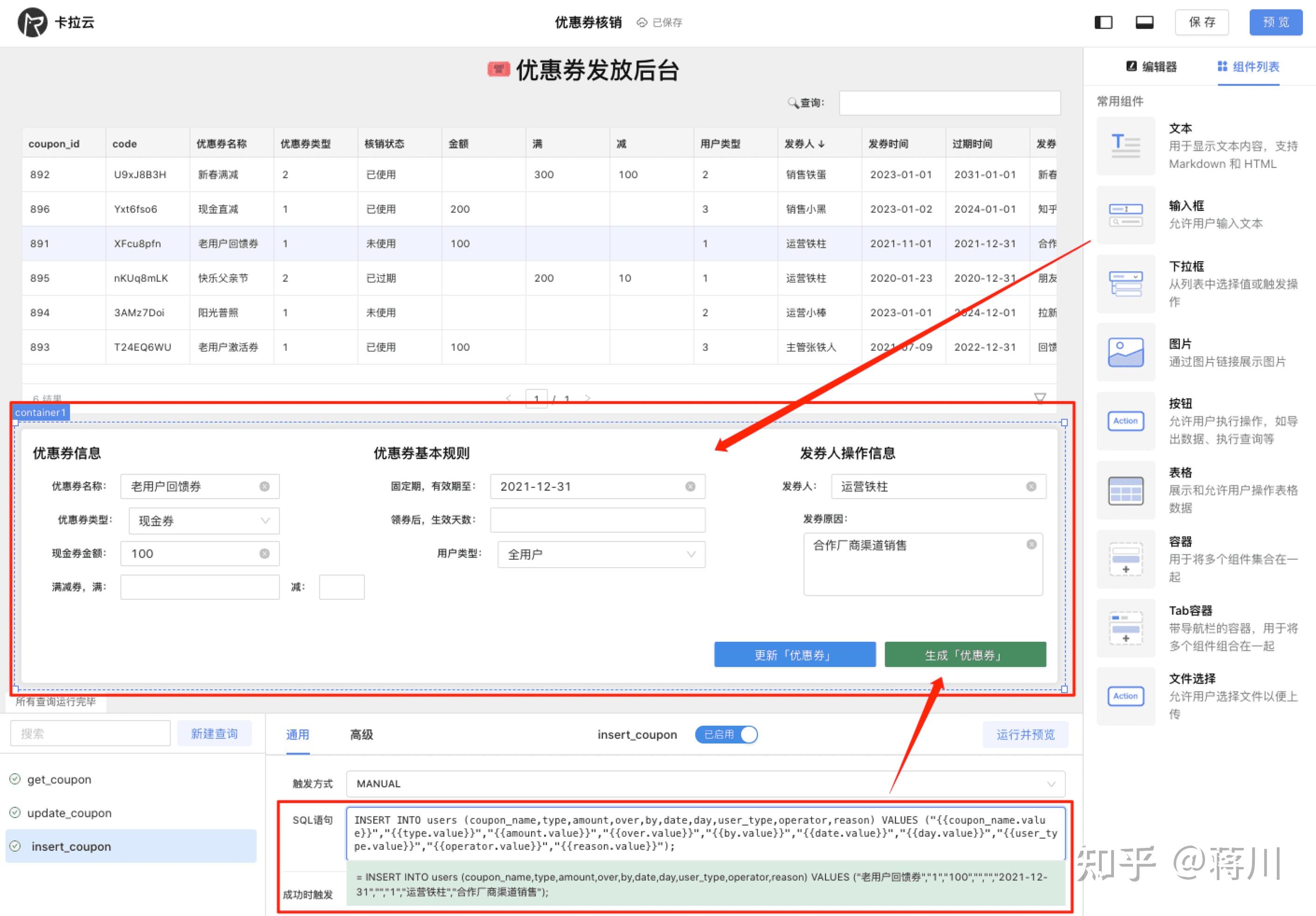 下图为使用卡拉云在 5 分钟内搭建的「 优惠券发放核销 」后台,仅需要简单拖拽即可快速生成前端组件,只要会写 SQL,便可搭建一套趁手的数据库工具。 欢迎 试用卡拉云 。