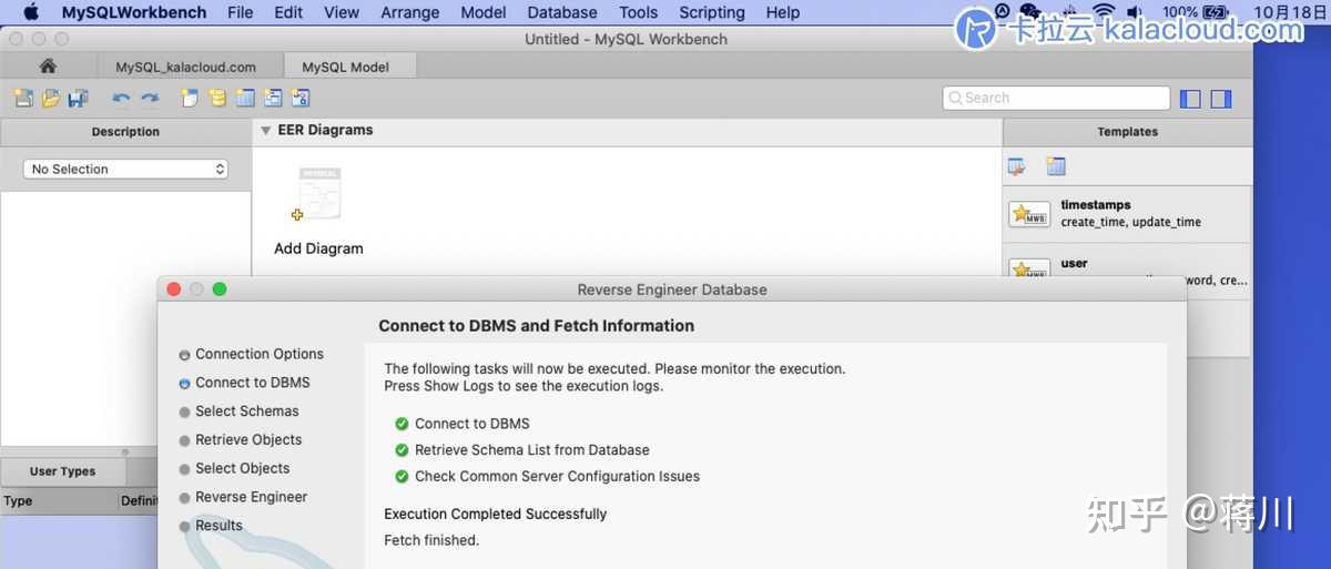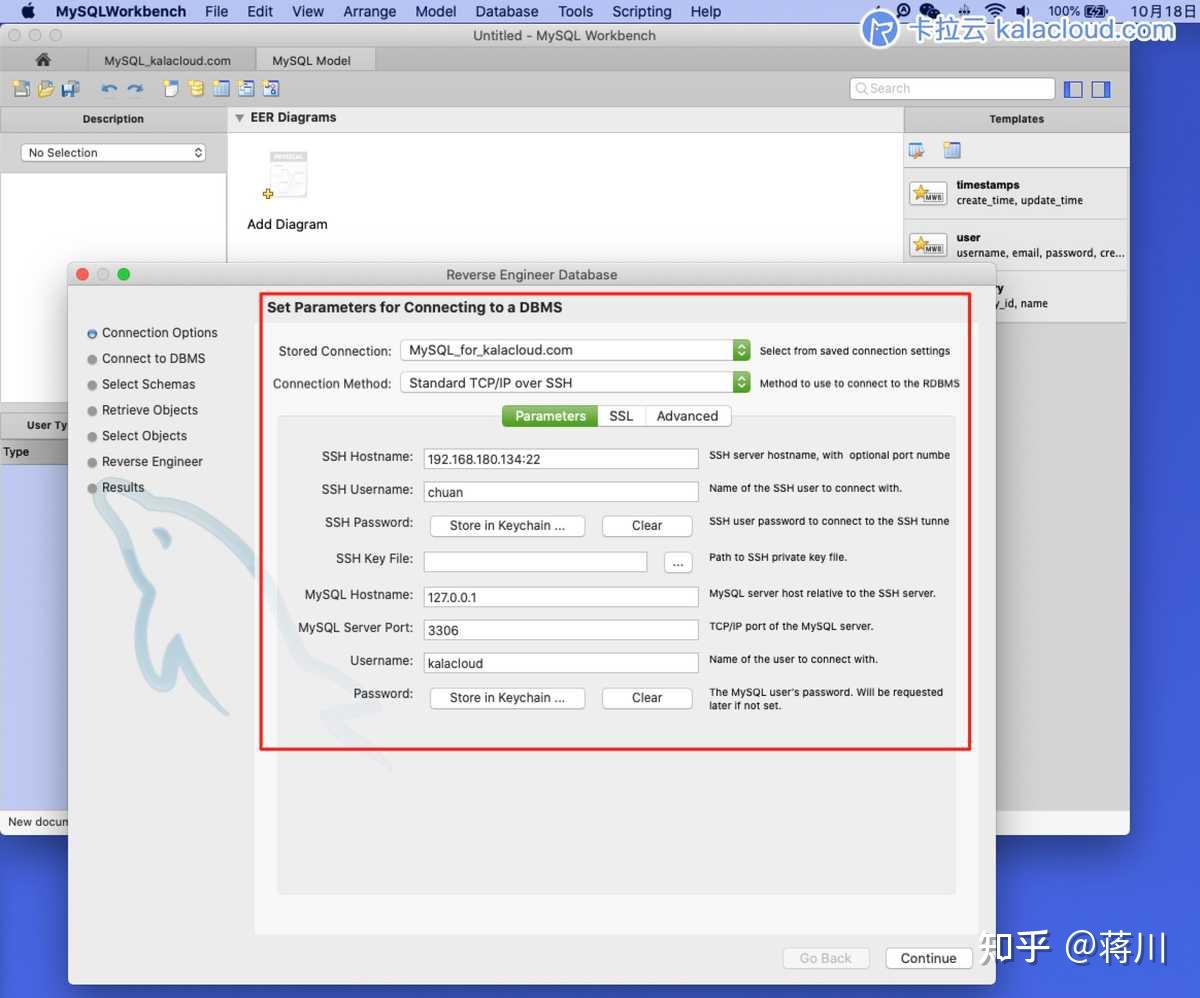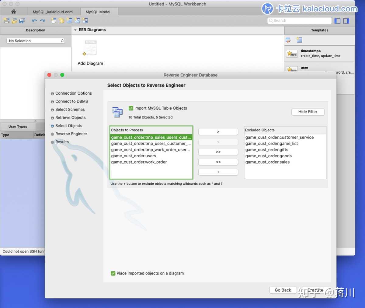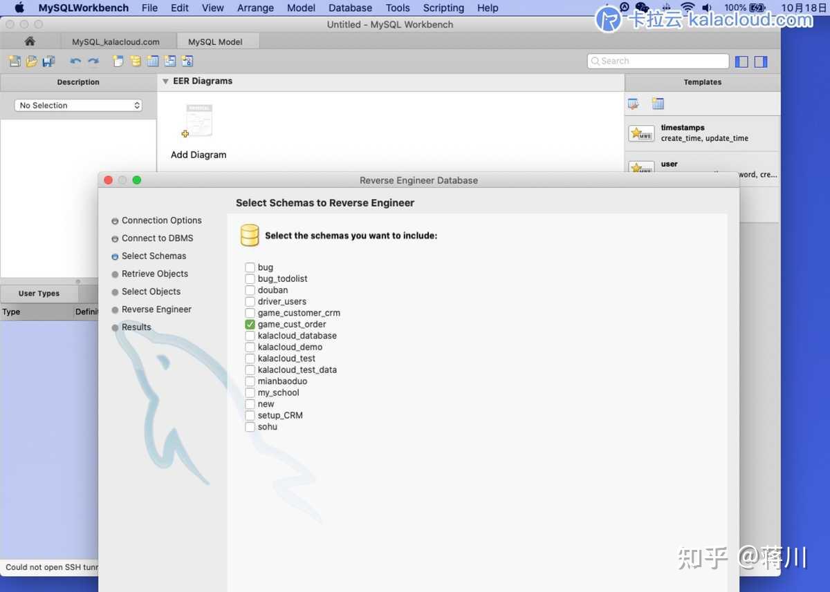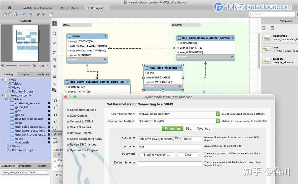 本教程演示的是连接到卡拉云( kalacloud.com )的 MySQL 测试服务器,各位可根据自己需求,选择需要创建 ER 图的数据库。