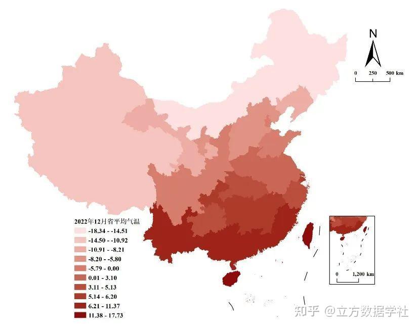 33个省级区划的1950-2022年逐月的平均气温汇总在一个Shp文件中,下面我们以2022年12月为例来预览一下:
