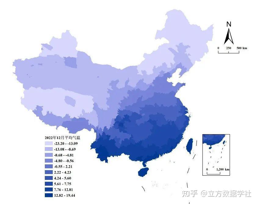 369个地级市的1950-2022年逐月的平均气温汇总在一个Shp文件中,下面我们以2022年12月为例来预览一下: