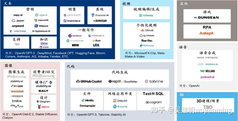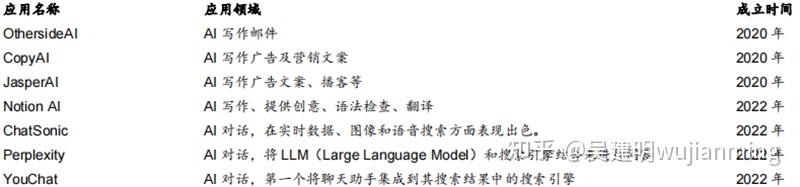 AI 可分为生成式 AI 和分析型 AI,其中分析型 AI(Analytical AI),主要在给定数据的情况下,通过分析找出规律和关系,并在此基础上生成报告或给出建议。比如通过追踪客户行为以刻画用户画像,并基于此进行个性化推荐,实现精准营销;通过收集城市中传感器的大量数据并分析,预测天气及环境污染情况,从而帮助相关部门进行政策制定。不同于分析型 AI 局限于分析已有内容,生成式 AI(Generative AI)可以通过学习已有数据和信息生成多种形式的新的内容,在创造性工作的领域进行应用,目前生成式 AI 的应用主要包括生成文本、图像、对话、音视频、代码、3D 等。