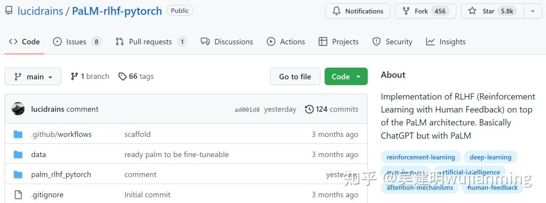 第一个项目是「PaLM-rlhf-pytorch」,项目作者为 Phil Wang。该项目是在 PaLM 架构之上实现 RLHF(人类反馈的强化学习),它基本上是使用 PaLM 的 ChatGPT。