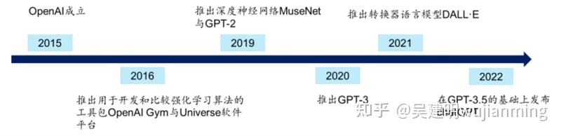2016 年,推出用于开发和比较强化学习算法的工具包 OpenAI Gym,加速公开社会中 RL 研究进度。同时推出 Universe 软件平台,用于测试和训练 AI 在全球游戏、网站和其他应用程序中的智能程度。2019 年,OpenAI 推出深度神经网络 MuseNet,可以使用 4 种不同的乐器生成 10分钟的音乐作品以及最终模型版本的 GPT-2。2020 年,研发团队在 GPT-2 的基础上拓展参数,发布了 GPT-3 语言模型。2021 年,发布了转换器语言模型 DALL·E,从文本描述生成图像。2022 年,OpenAI 在 GPT-3.5 的基础上推出了 ChatGPT,强化了人工智能的语言对话能力,引起社会广泛关注。