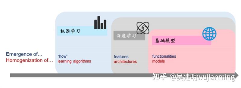 2021 年 8 月,李飞飞等学者于 arXiv 发表《On the Opportunities and Risk of Foundation Models》,将大模型统一命名为 Foundation Models,即基础模型或基石模型。此外,论文还提出基础模型面临的两大问题:1)同质化。尽管基础模型基于标准的深度学习和迁移学习,但其规模导致了新能力的涌现,其在众多任务中的有效性激励了同质化的产生;2)特性涌现。尽管基础模型即将被广泛部署,但目前研究者对其如何工作、何时失效以及其涌现的特性衍生了何种能力尚缺乏清晰的理解。举例来看,如机器学习的引入,使得算法从数据案例中学会了如何执行(自动推断);深度学习的引入,涌现了用于预测的高级特征;基础模型的引入,涌现了上下文学习等高级功能。但在这一过程中,机器学习使学习算法变得同质化(例如,逻辑回归),深度学习使模型架构同质化(例如,卷积神经网络架构),大模型使得下游模型同质化(例如,下游模型一定会继承上游模型缺陷)。