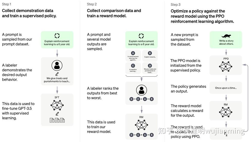 ChatGPT 使用来自人类反馈的强化学习 (RLHF) 来训练该模型。首先使用监督微调训练了一个初始模型:人类 AI 训练员提供对话,他们在对话中扮演双方——用户和 AI 助手。其次,ChatGPT 让标记者可以访问模型编写的建议,以帮助他们撰写回复。最后,ChatGPT 将这个新的对话数据集与原有数据集混合,将其转换为对话格式。具体来看,主要包括三个步骤: