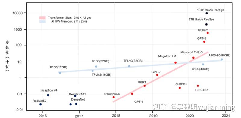 从大模型自身的发展过程来看,参数量的变化是一个非常值得关注的指标。从最早的 ResNet、Inception 等模型,到如今的 GPT,模型参数量不断增长。2018 年前后 OpenAI 先后推出 Transformer 和GPT-1 模型,参数量来到 1 亿级别。随后谷歌提出 3 亿参数的 BERT 模型,参数量再次增长。2019、2020 年,OpenAI 加速追赶,陆续迭代出 GPT-2、GPT-3 模型,参数量分别为15 亿、1750 亿,实现模型体量质的飞跃。另一方面,参数运算需要大规模并行计算的支持,核心难点在于内存交换效率,取决于底层 GPU 内存容量。以英特尔为例,从 2017 年 V100的 32GB 内存到 2020 年 A100 的 80GB 内存,GPU 内存容量的提升量级与模型参数相比显然不在同一量级。而 ChatGPT 的解决方法,则是与微软联手,借助 Azure 强大的基础算力设施,为 ChatGPT 提供训练支持。