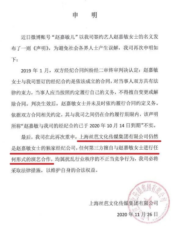 从中戏毕业后,2020年11月赵嘉敏单方面发布声明表示已经跟丝芭解约,没想到隔天就被打脸了。丝芭在声明里重申赵嘉敏跟公司依然在合约期内,还表示如果有第三方想跳过公司跟她合作,公司就会采取法律措施。简单来说,就是丝芭在警告赵嘉敏不要私下接活,不然没有好下场。