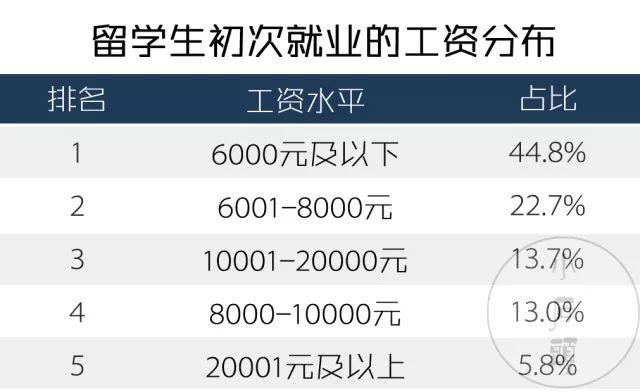 也就是说,近半数留学生初次就业税后月收入低于6000元,近7成认为月工资远低于期望,15%的留学生职场竞争力甚至低于国内二本高校的毕业生。