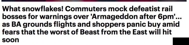 暴雪一来,英国各大媒体就开始夸大其词地渲染,试图营造一种世界末日的悲凉感,比如daily mail就称之为 “beast from east”,