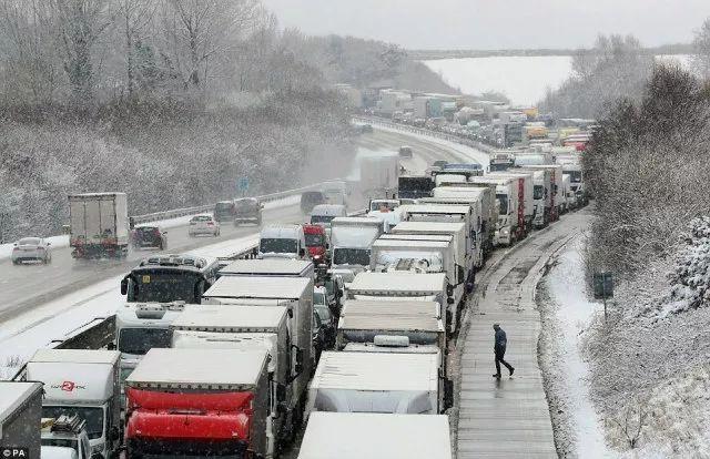 还有下雪堵在路上的车。