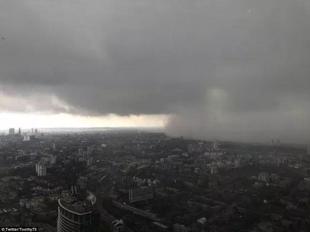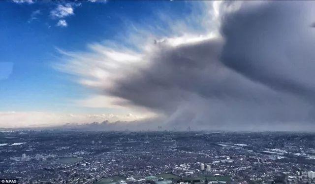 英国空中警察防卫队甚至从空中拍到了伦敦在风雪来临前的黑云压城的奇异景观。