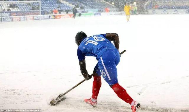由于雪太厚,足球队的运动员们只好先铲起了场地上的雪。