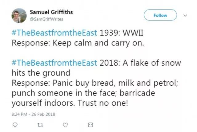 还有网友吐槽:1939年二战来的时候,大家都表示:镇静,一切如常;2018年,一场大雪来了,大家陷入了恐慌,买面包牛奶汽油渡劫,打别人的脸,把自己关在房子里不出去,不相信任何人。