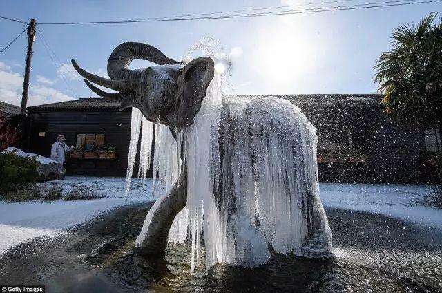 就连大象喷泉也是被冰柱包围。