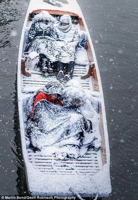 在雪天乘着小船漫游河中,只好被雪花覆盖,变成了雪人。