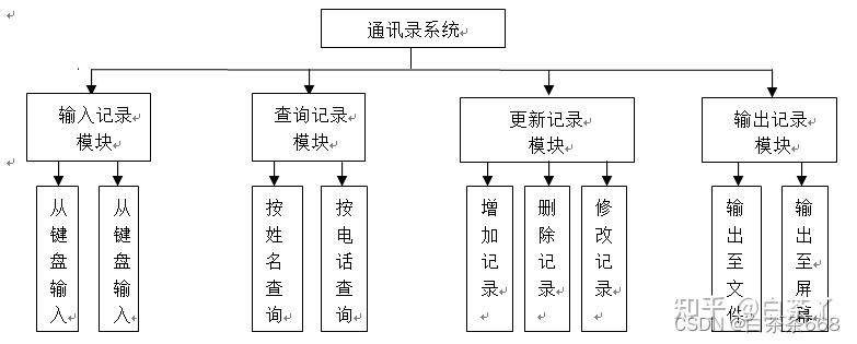 - 更新记录模块。完成对联系人记录的维护。在此通讯录系统中,它实现了对联系人记录的增加、删除及修改操作,并将修改后的数据存入源数据文件。